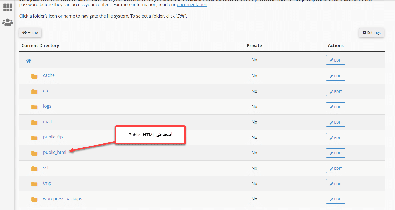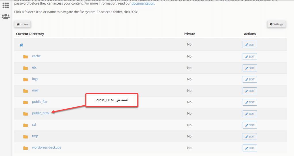 - تفتح لك كل المجلدات الموجودة داخل مجلد Public HTML، ومن هذه المجلدات اختر المجلد الذي تريد حمايته.