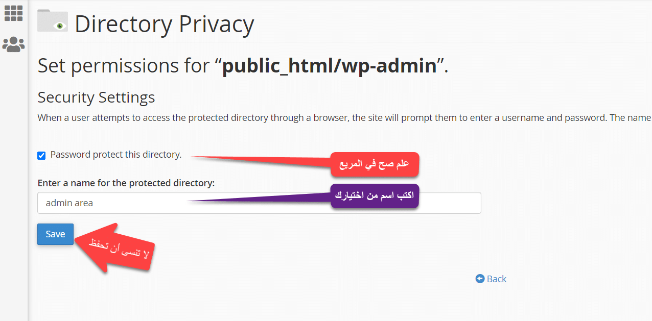 - تظهر لك نافذة كما بالصورة التالية، منها ضع علامة صح في المربع بجانب جملة password protect this directory ثم ضع اسم لهذا المجلد من اختيارك ثم اضغط على حفظ.