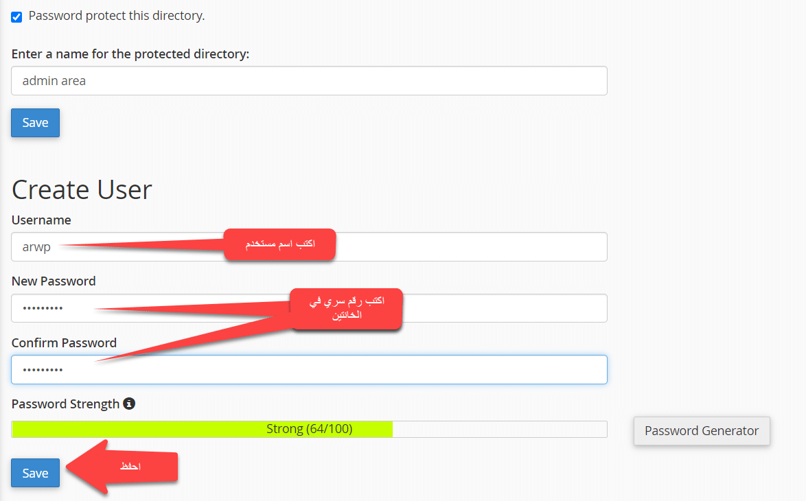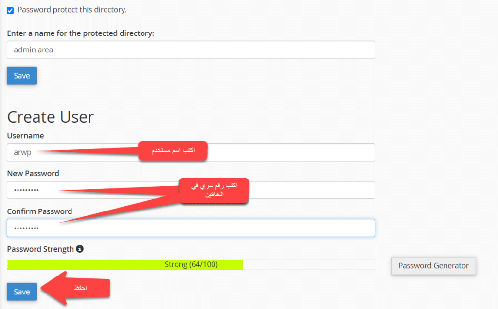 - اكتب في خانة Username اسم مستخدم من اختيارك واكتب أيضًا كلمة مرور من اختيارك وأكّد على كلمة المرور ثم اضغط على حفظ الموجودة بالأسفل في قسم Create User.
