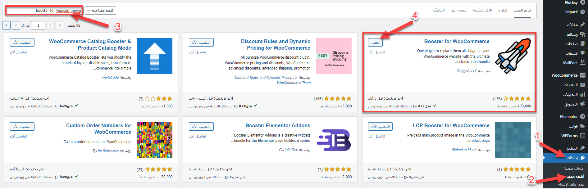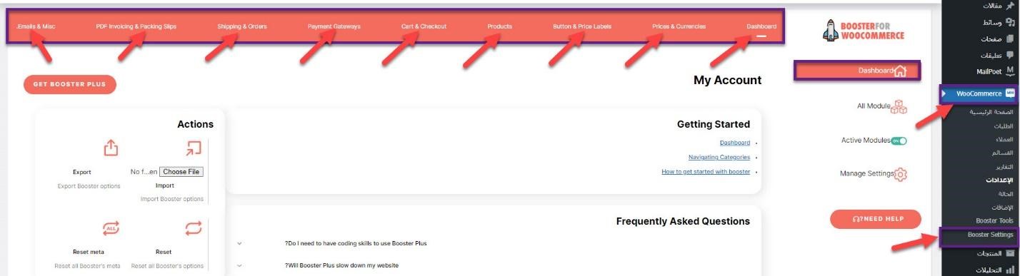 من لوحة تحكم ووردبريس ومن تبويب ووكومرس اضغط على إعدادات بوستر Booster Settings.