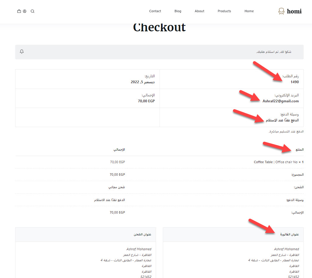 الآن إذا ذهبنا إلى المتجر وقمنا باختيار منتج من المتجر وكتبنا بيانات الشحن واخترنا طريقة الدفع نقداً عند الاستلام ثم تأكيد الطلب.
