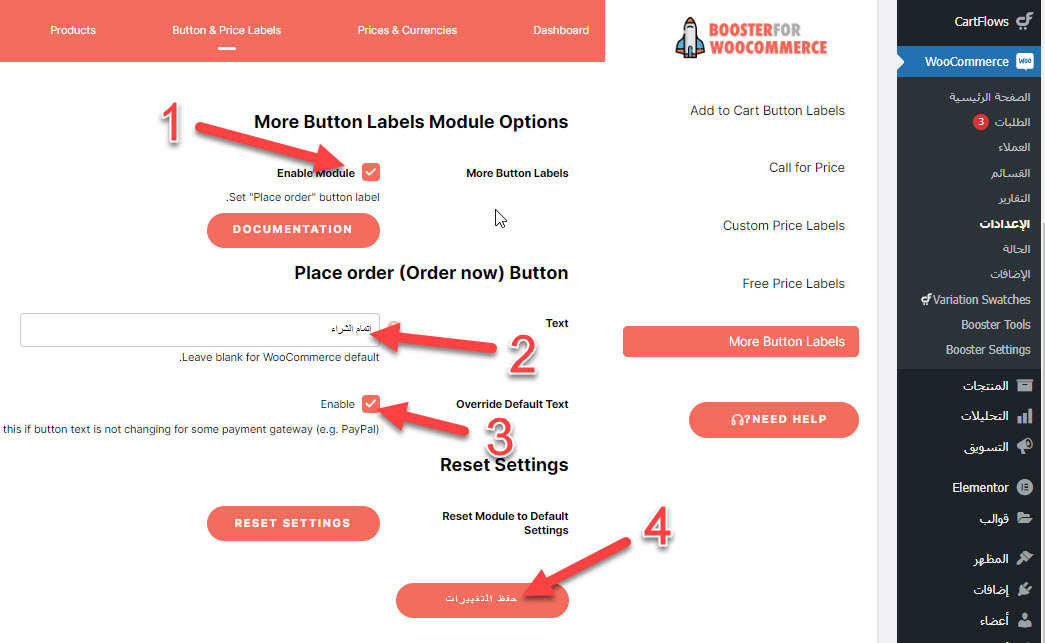 من لوحة تحكم ووكومرس اضغط على Booster Settings ثم اضغط على الأزرار وحقول السعر Button & Price Labels.