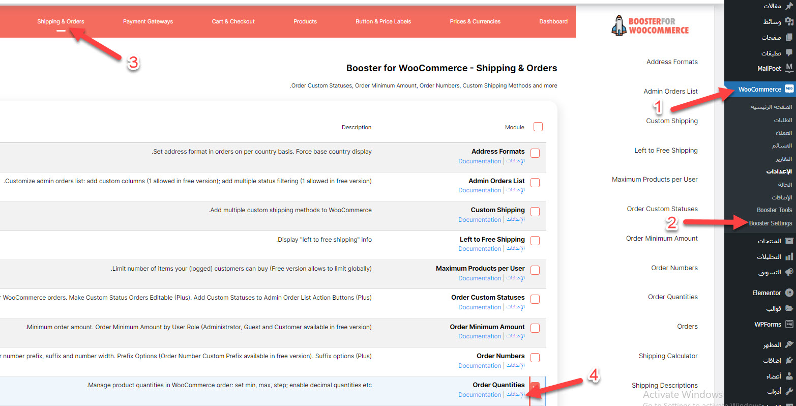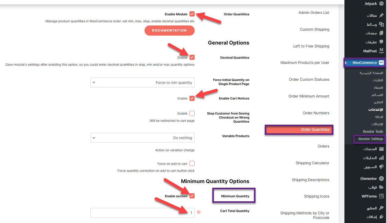 اذهب إلى لوحة تحكم ووكومرس واضغط على Booster Settings ثم اضغط على تبويب Shipping & Orders، ثم فعل الخيار Order Quantities، وبعد ذلك اضغط على حفظ التغييرات.