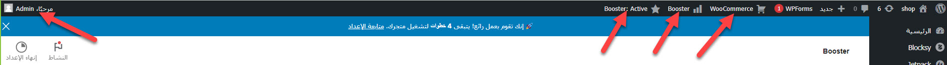 من الأفضل أن يكون أمامك في شريط الإدارة Admin Bar، شريط إعدادات ووكومرس WooCommerce bar وكذلك شريط إعدادات بوستر Booster Settings bar، حتى تستطيع التعامل بسهولة مع متجرك بدلاً من الذهاب كل مرة إلى لوحة التحكم لإعداد أو تغيير شيء على متجرك، ولتنفيذ هذه الطريقة يمكنك اتباع الخطوات التالية:
