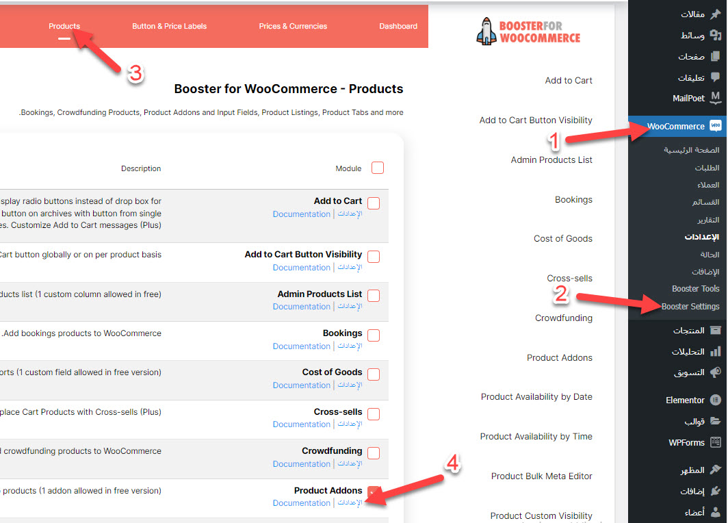 من لوحة تحكم ووكومرس اضغط على Booster Settings ثم اضغط على تبويب المنتجات Products في لوحة التحكم.