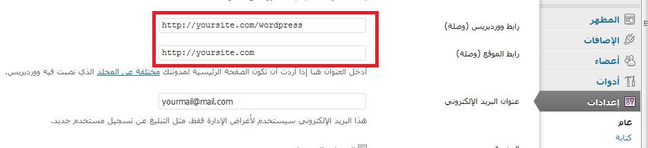 4- ادخل إعدادات ثم عام وقم بتغيير (رابط الموقع) إلى اسم النطاق فقط بدون المجلد الفرعي