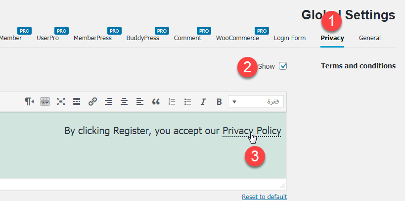 - إدراج رابط صفحة الأحكام والشّروط ضمن النصّ، كما يمكنك تعريبه إذا شئت.