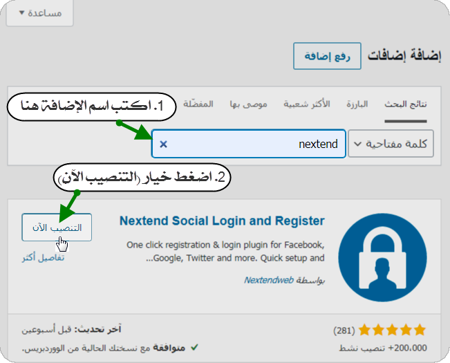 اكتب في خانة البحث اسم الإضافة: Nextend، وانتظر ظهور النّتائج. ثم اضغط على خيار "التّنصيب الآن" المحاذي للإضافة "Nextend Social Login and Register" كما تظهر الصّورة: