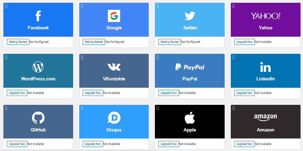 ستظهر لك عندها صفحة (Providers) أو (المزوّدون)، وهي صفحة من 12 مزوّد خدمة التّسجيل والدّخول. أو بعبارة أخرى 12 موقعا يمكن الاستعانة بها للتسجيل والدّخول إلى مواقع ووردبريس.
