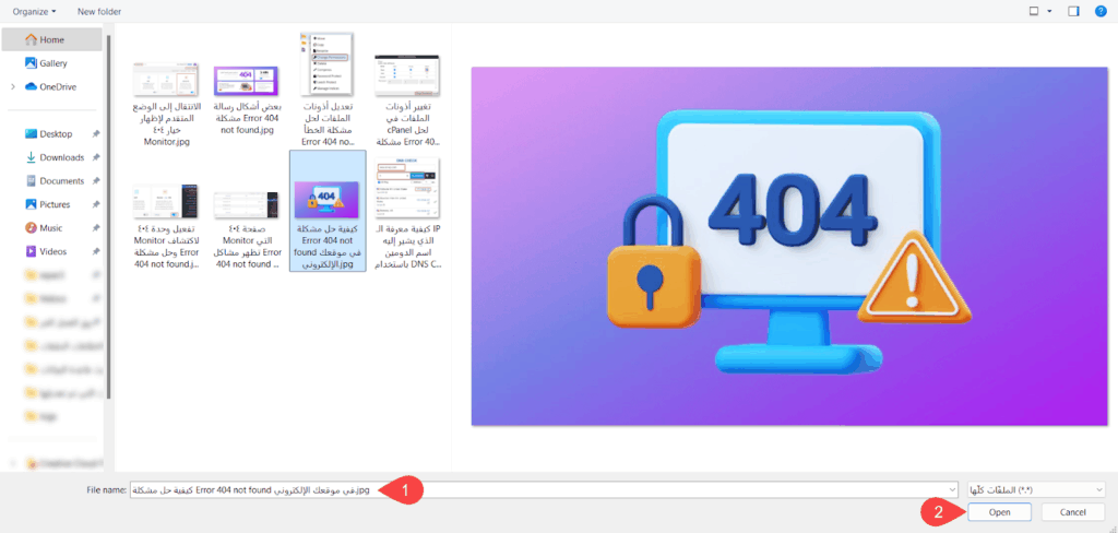 يتم تسمية الوسائط والملفات قبل رفعها مباشرة إلى الموقع، فبعد تحديد الملف الذي أريد رفعه إلى الموقع، أقوم بتسميته بالاسم المناسب له عبر وضعه في حقل (File name) المخصص لذلك.