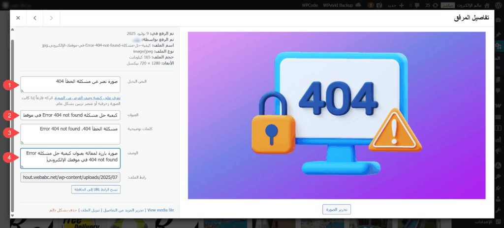 بعد رفع الملف إلى مكتبة الوسائط دائمًا ما أختار عنوانًا ونصًا بديلًا مناسبًا له، وهذا أمر مهم جدًا، حيث أن النص البديل للصورة يصف محتواها لمحركات البحث وكذلك الأمر بالنسبة لبقية الملفات، وهذا ما يسهم في تحسين سيو الموقع وتجربة المستخدم فيه.