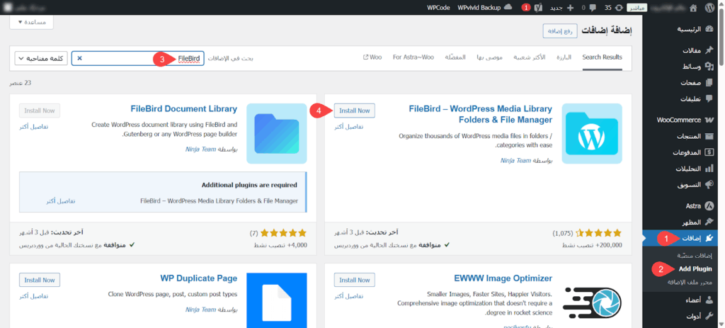 من الإضافات التي أعتمد عليها لذلك إضافة FileBird، فعندما أكون بحاجة لإنشاء مجلدات داخل مكتبة الوسائط أقوم بداية بتثبيتها بالطريقة الاعتيادية.