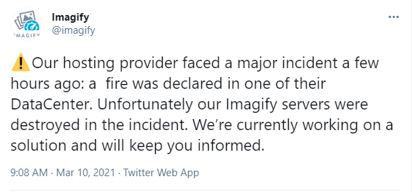أعلن الحساب الرسمي لإضافة Imagify أن سيرفراتها قد تعرضت لحريق كبير، أدّى لتدميرها بالكامل.
