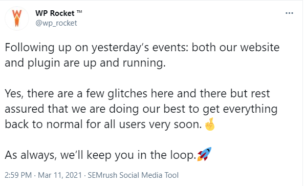 وخلال يومٍ واحد كذلك، استطاع المطورون إعادة العمل بشكلٍ كامل في إضافة WP Rocket، مع وجود بعض المشاكل التقنية الصغيرة التي قد تواجه بعض المُستخدمين.