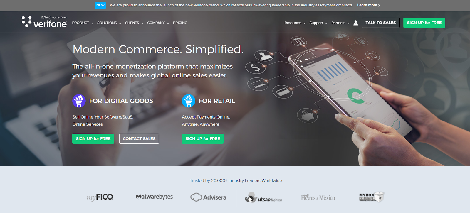 تم إنشاء بوابة الدفع 2Checkout عام 2000 م، حتى تم الاستحواذ عليها من قبل شركة Verifone في عام 2020 م، وأصبحت بالمسمى الجديد Verifone، وتوفر للعملاء عدة مميزات، أهم تلك المميزات هو الآتي: