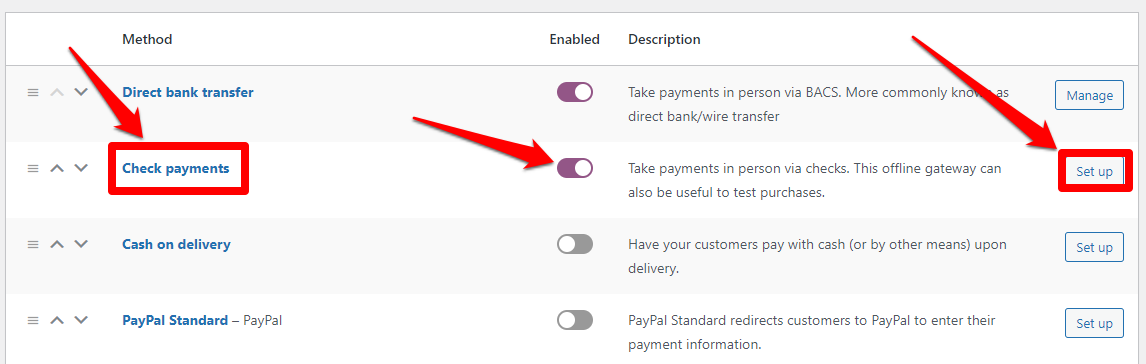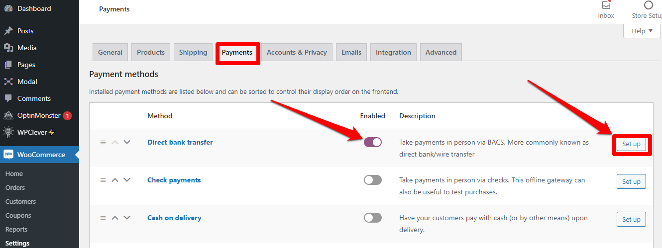 حيث يمكنك أخذ المدفوعات عن طريق تحويلات بنكية مباشرة. ولتفعيل هذا الخيار، فعل زر التمكين Unable. ثم انقر على ضبط الاعدادات Set up. كما في الصورة أدناه.