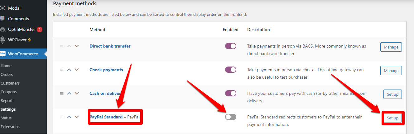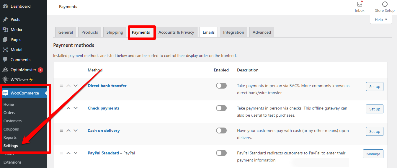 توجه إلى منصة ووكومرس، وعلى القائمة الجانبية لواجهة المُستخدم، ادخل إلى إعدادات ووكومرس Settings ثم انقر على المدفوعات Payements ثم اتبع الخطوات التالية :