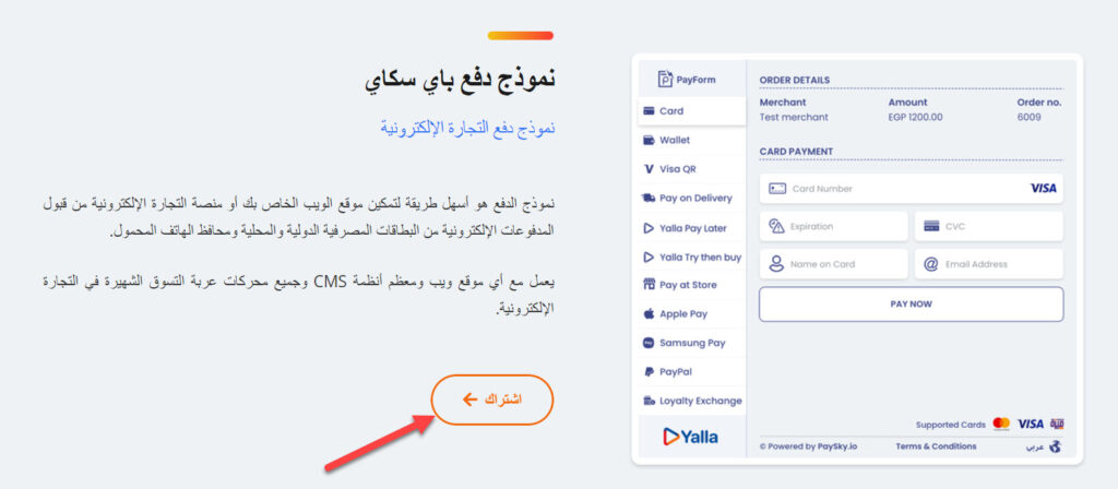 سيتم نقلك مباشرة إلى قسم نموذج دفع باي سكاي للتجارة الإلكترونية. للاشتراك بالخدمة، انقر على زر (اشتراك) الظاهر أسفل الشرح الموجز عنها.