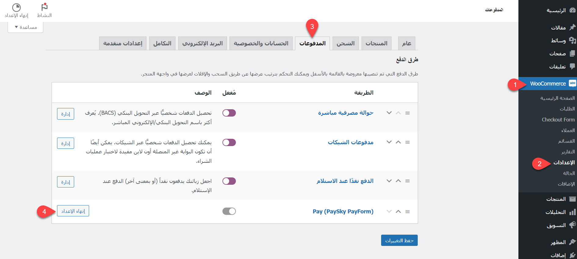 بعد تفعيل الإضافة، عليك إعداد بوابة الدفع باي سكاي في متجرك الووكومرس، ولفعل ذلك توجه إلى إعدادات WooCommerce، ثم انتقل إلى تبويب (المدفوعات)، وانقر على زر (إنهاء الإعداد) الموجود بجانب خيار بوابة الدفع التي تمت إضافتها حديثًا إلى القائمة (Pay PaySky PayForm).
