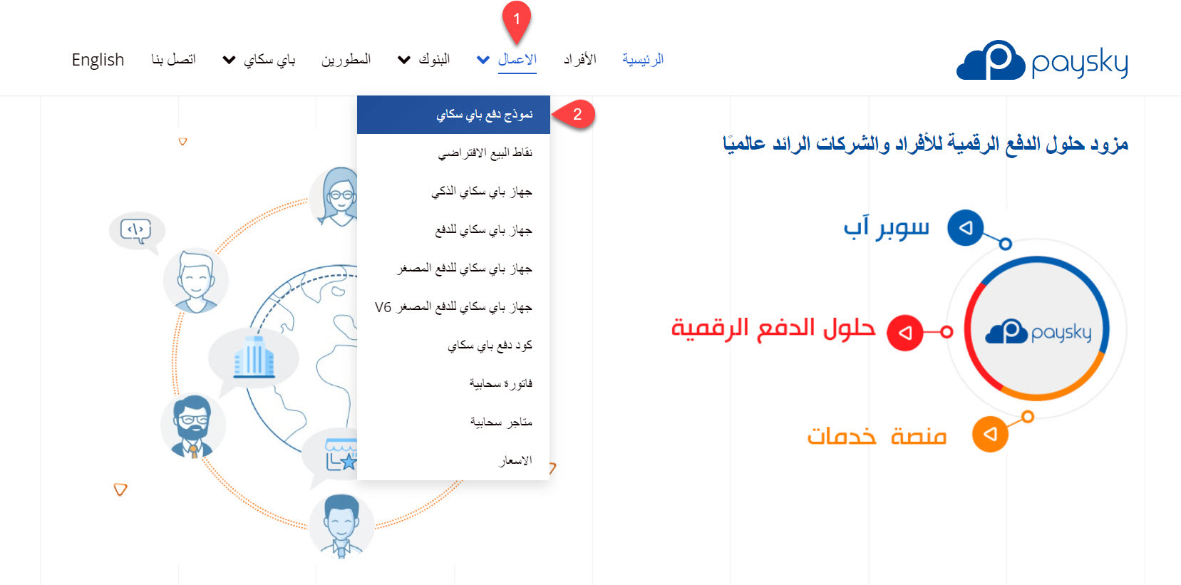 لإنشاء حساب أعمال من أجل الاستفادة من ميزة نموذج دفع باي سكاي، يجب أن تتوجه أولًا إلى الصفحة الرئيسية لموقع PaySky، ثم تختار من قائمة (الأعمال) خيار (نموذج دفع باي سكاي) للانتقال إلى القسم المعني بهذه الميزة ضمن الموقع.