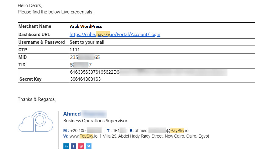 كما سيتم إرسال بيانات التواصل مع عضو فريق دعم العملاء الذي يشرف على حسابك ضمن رسالة بيانات حساب باي سكاي المفعل، ويمكنك التواصل معه عبر البريد الإلكتروني أو الهاتف ليساعدك على حل أي مشكلات يمكن أن تحدث معك أثناء استخدام بوابة الدفع.