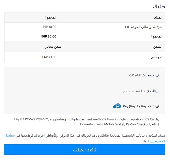 وبهذا تكون قد فعلت بوابة الدفع PaySky في متجرك الووكومرس، ويمكن البدء بتلقي المدفوعات من خلالها، حيث ستظهر كإحدى طرق الدفع في المتاحة في صفحة إتمام الطلب.