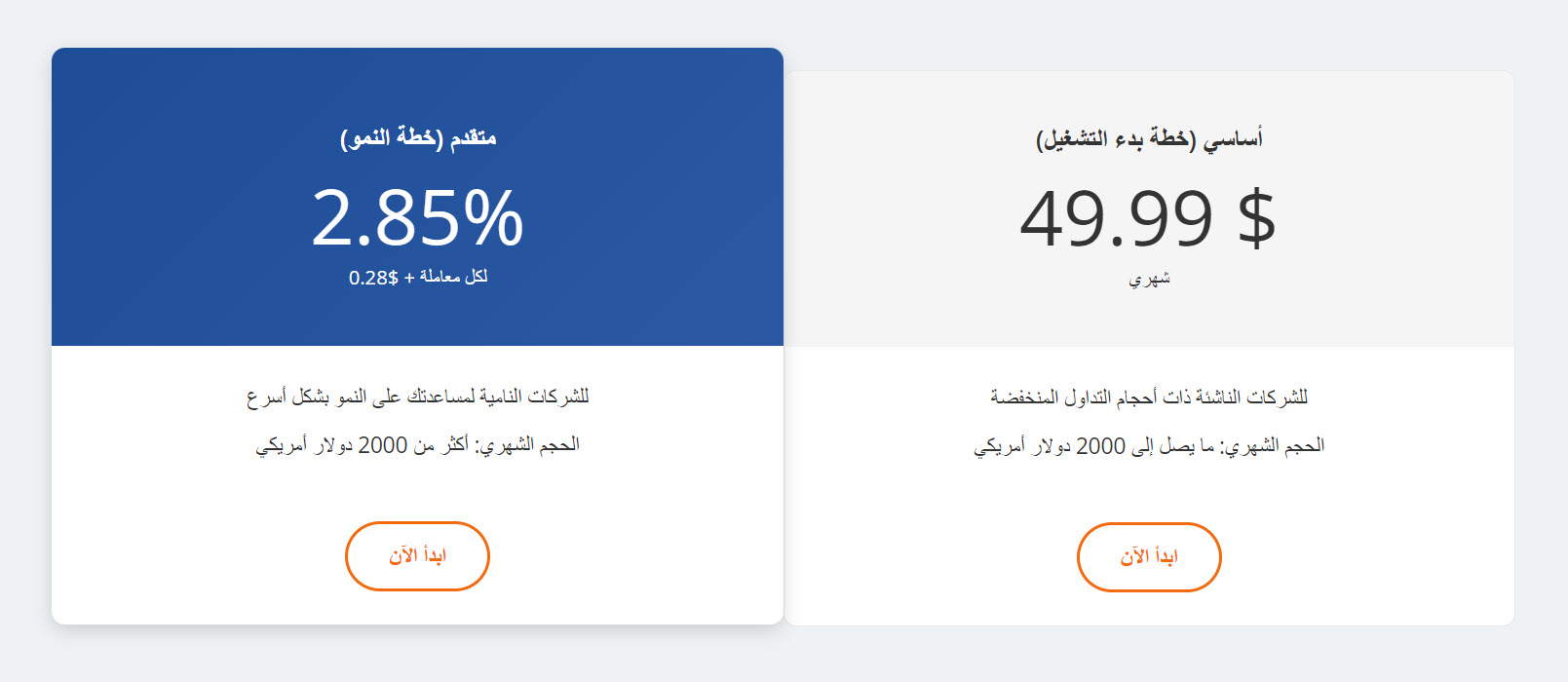 يحتسب سعر الخطة الأولى (الأساسية) على أساس شهري ثابت يبلغ 49.99$ دون رسوم على المعاملات، بينما يحتسب سعر الخطة الثانية (المتقدمة) بناء على قيمة وعدد المعاملات الشهرية، حيث يتم تقاضي 2.85% من قيمة المعاملة بالإضافة إلى 0.28$ لكل معاملة.