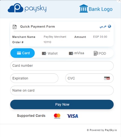وعند التقدم لتأكيد الطلب وإتمام عملية الدفع، سيظهر نموذج دفع باي سكاي للعميل، ويمكنه الدفع باستخدام إحدى وسائل الدفع التي توفرها البوابة، مثل بطاقات فيزا وماستر كارد، والمحفظة، وبطاقات يلا وغيرها.