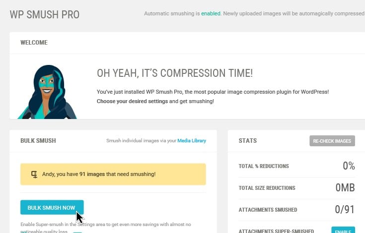 ويأتي دور WP Smush كأشهر إضافة في مجال ضغط الصور بين مستخدمي الووردبريس، حيث يتميز بواجهة مستخدم جميلة، كما تعطيك معلومات عن الصور التي تم تحسينها وكم من الحجم تم ضغطه. والعديد من المميزات الرائعة كالآتي: