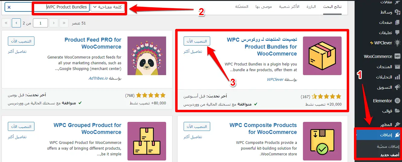 • اكتب اسم الاضافة WPC Product Bundles في مربع البحث، وبعد ظهورها انقر على التنصيب الان.