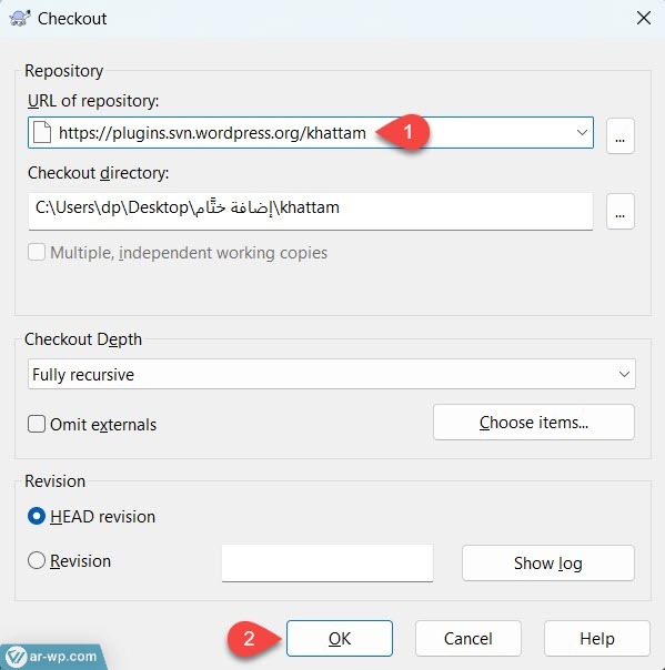بعد الاطلاع على التعليمات ومطالعة الروابط، نصبت على حاسوبي برنامج TortoiseSVN الذي يسهل العمل مع نظام SVN، مع العلم أنه يمكن العمل على رفع الإضافة من خلال سطر الأوامر، لكن استخدام برنامج أسهل. بعد ذلك أنشأت مجلدًا فارغًا على الحاسوب باسم khattam، ثم نقرت عليه بزر الماوس الأيمن، واخترت (Checkout) من قائمة TortoiseSVN.