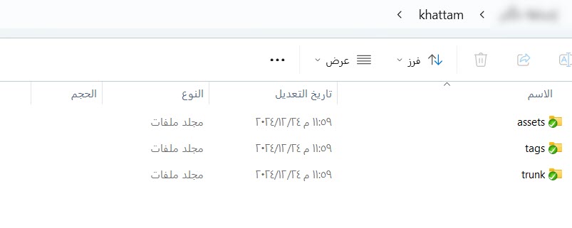 تمت مباشرة مزامنة المستودع مع المجلد الفارغ الذي أنشأته باسم (khattam)، وأصبح المجلد يتضمن المجدات (assets - tags - trunk)، ولكي تتعرف على ما تمثله هذه المجلدات يجب أن تقرأ المصادر التي ضُمنت في رسائل البريد الإلكتروني من ووردبريس.