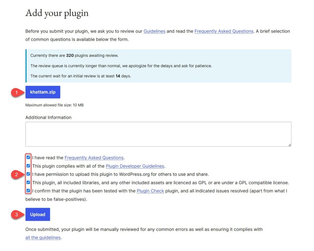 ضغطت مجلد الإضافة على شكل ملف zip، ثم أرسلتها إلى مستودع ووردبريس الرسمي من خلال صفحة Add your Plugin. بعد فتح الصفحة وتسجيل الدخول، نختار ملف الإضافة بالنقر على زر (Select File)، ثم نضع أي ملاحظات مهمة حول الإضافة في حقل (Additional Information)، وبعد ذلك نؤكد الالتزام بالشروط وننقر على زر (Upload) للرفع.