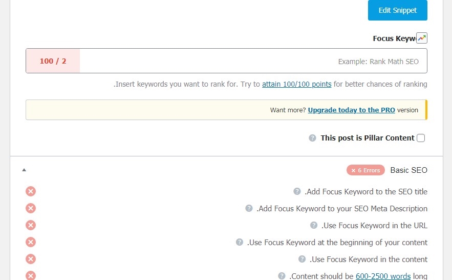 بدايةً من المهم إضافة الكلمة المفتاحية للمقال والتي على أساسها يبنى كل محتوى المقال، بمقالنا هذا مثلاً ستكون الكلمة المفتاحية هي (Rank Math)