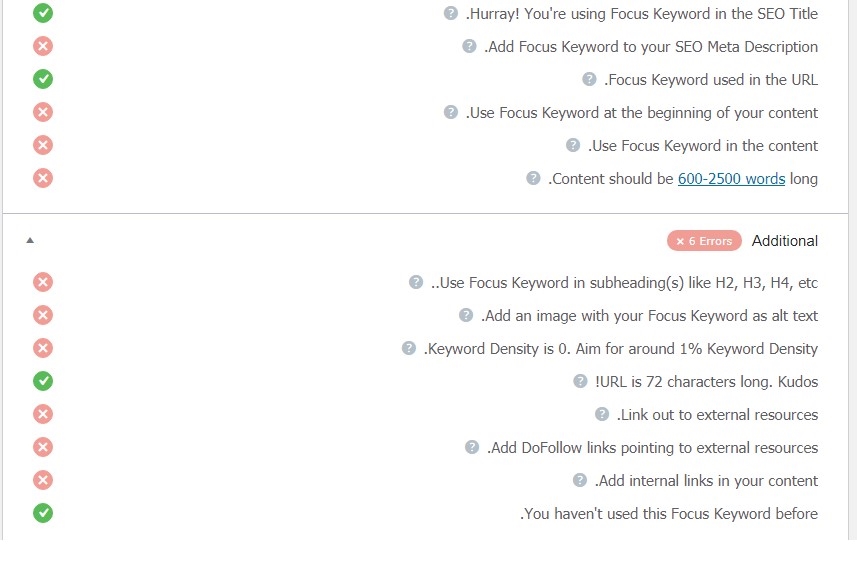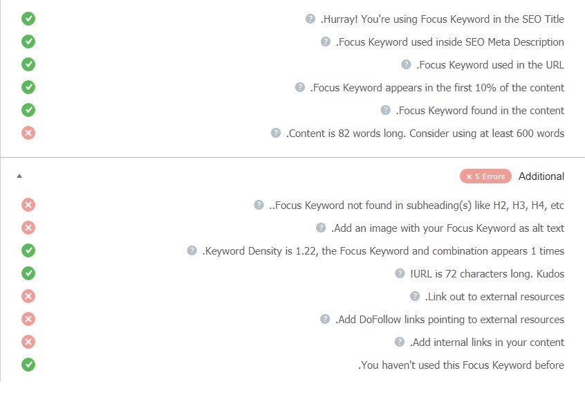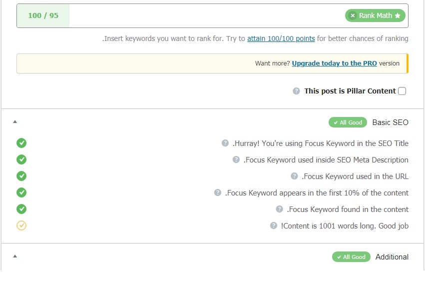 نقصد هنا بالمعايير أو البنود الإضافية، تلك المشار لها في إضافة Rank Math تحت مسمى Additional، وهي مكونة من 8 معايير، وهي: