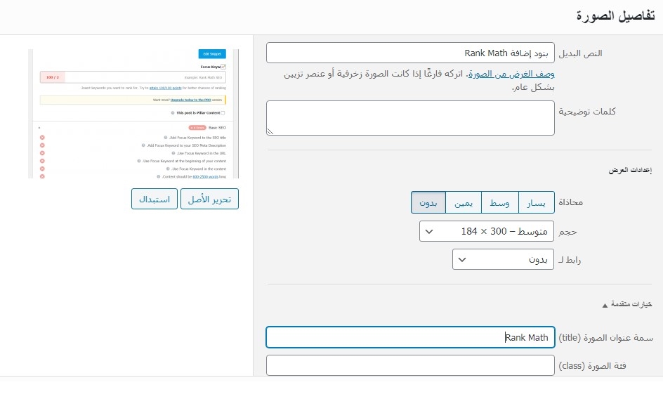 فبعد إضافة صورة واختيار تحرير لها نقوم بكتابة النص البديل بحيث يحتوي الكلمة المفتاحية (Rank Math) كما في الشكل التالي: