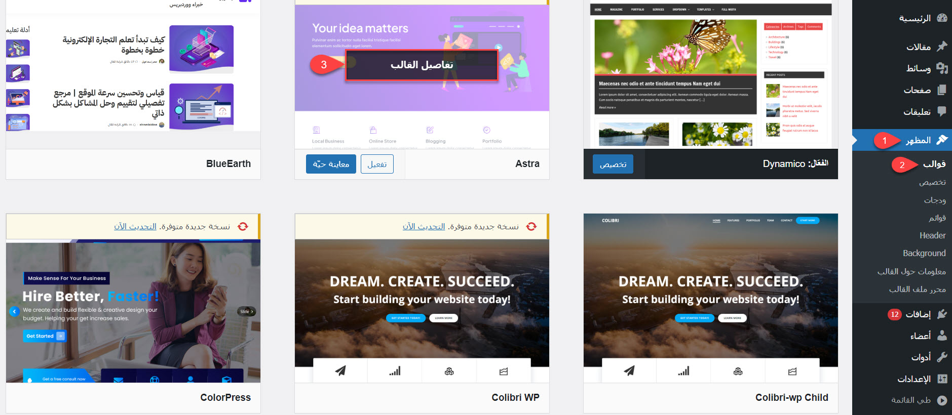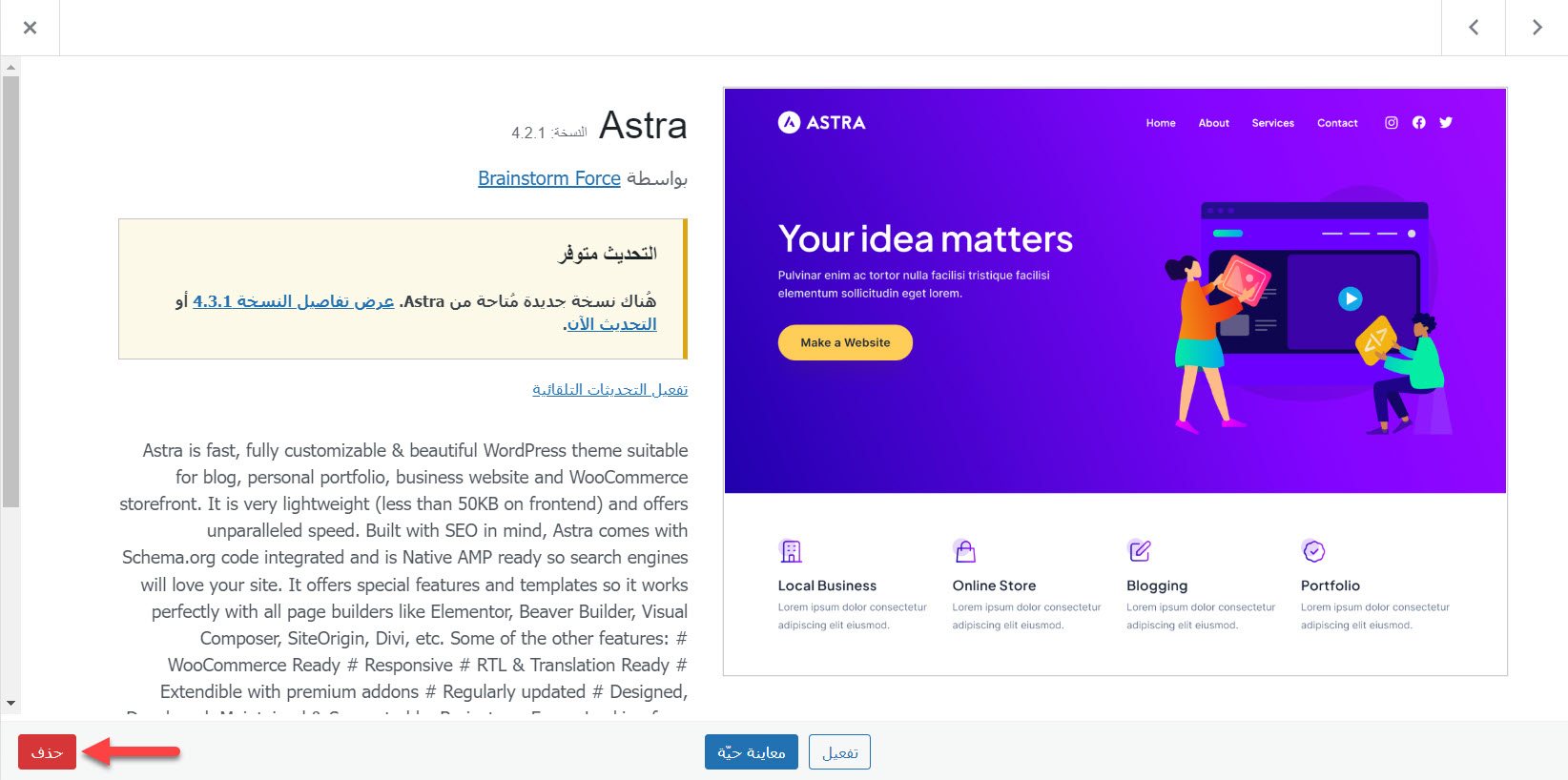 ستظهر لك صفحة تضم جميع قوالب الووردبريس المثبتة على موقعك. انقر على (تفاصيل القالب) ضمن أيقونة القالب الذي ترغب في حذفه.