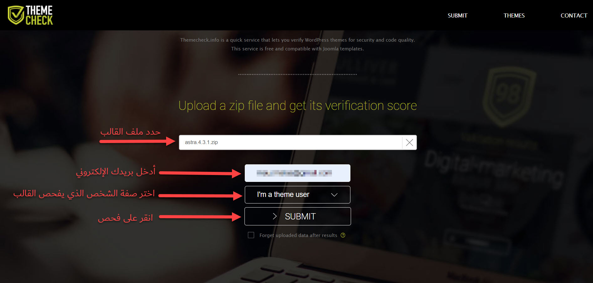 ثم يجب اختيار صفة الشخص الذي يرغب بفحص القالب (مطور القالب أو مستخدم القالب أو أحد آخر)، ثم إدخال بريدك الإلكتروني والنقر على (SUBMIT)، بعد ذلك ستظهر لك صفحة نتائج فحص القالب.