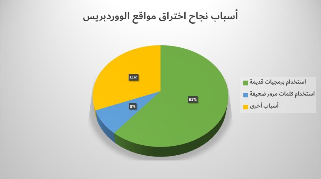 حيث تشير الإحصائيات إلى أن أكثر من نصف مواقع الووردبريس التي يتم اختراقها بنجاح تستخدم برمجيات قديمة، وحوالي 8% منها يتم اختراقها بسبب استخدامها كلمات مرور ضعيفة.