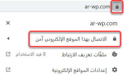 لاحظ أنه عند النقر على أيقونة القفل تظهر عبارة تفيد بأن الاتصال بالموقع آمن (الاتصال بهذا الموقع الإلكتروني آمن)، وعند النقر عليها يخبرك المتصفح بأن البيانات التي ترسلها إلى الموقع ستكون خاصة.