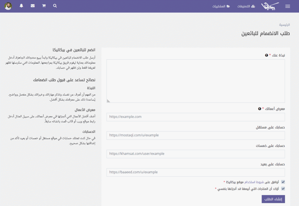بعدما تقوم بإنشاء حساب عادي على بيكاليكا من خلال حساب حسوب الموحّد، ستقوم في بتقديم طلب انضمام للبائعين، والذي يطلب فيه معلوماتك الأساسية والتي تحتاج لإبرازها بشكل جيد ليتم قبول طلبك للانضمام إلى البائعين على بيكاليكا.