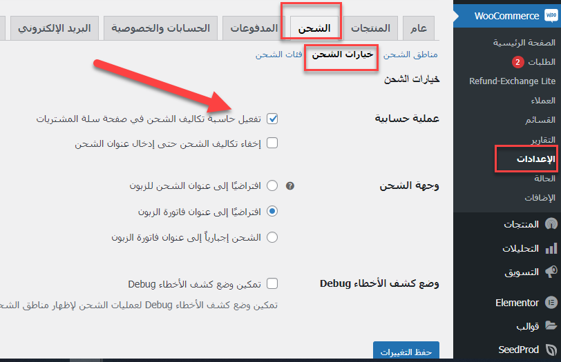 يمكننا استخدام الخيارات الإفتراضية داخل لوحة تحكم ووكومرس للتحكم في خيارات الشحن التالية: