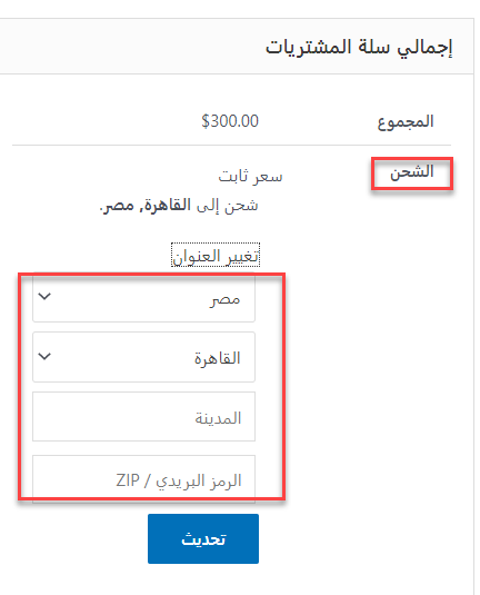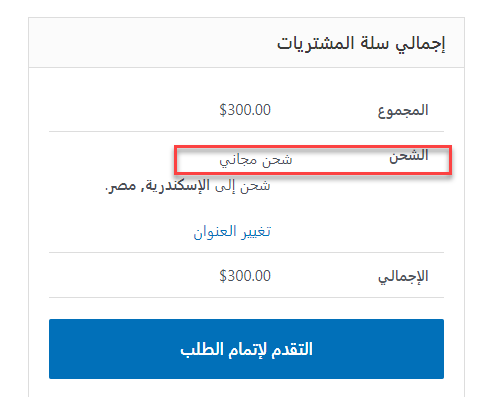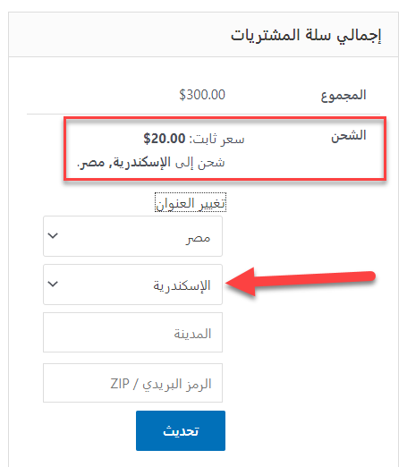 الأن عند دخول أحد الزبائن إلى المدن وطلب بعض المنتجات ليتوجه إلى سلة المشتريات، وقام باختيار منطقة الشحن هي (مدينة الإسكندرية) وهي إحدى المدن التي اخترناها في مناطق الشحن، سوف يظهر لك سعر الشحن الثابت وهو 20$ الذي قمنا بتعيينه من داخل صفحة الإعدادات: