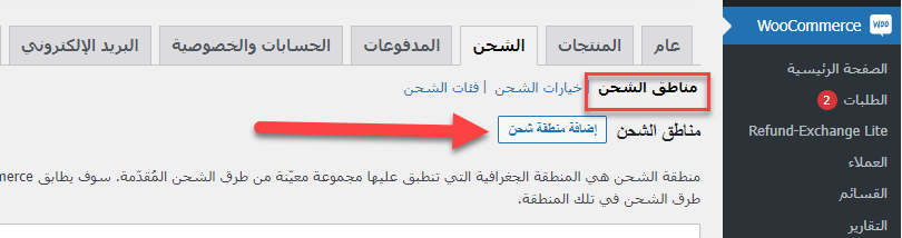 قم بالدخول إلى لوحة الإعدادات ثم الدخول إلى تبويب (مناطق الشحن)، ومنها انقر على إضافة منطقة شحن: