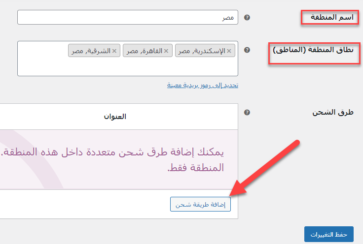 سوف تفتح لك صفحة تعيين منطقة الشحن، ومنها تكتب اسم منطقة الشحن، وليكن مثلاً (مصر)، ثم في المربع الآخر تقوم بإدخال المدن التي ترغب في إتاحة الشحن إليها داخل المنطقة المختارة وهي مصر. بعد إدخال اسم المنطقة واختيار المدن، قم بالنقر على إضافة طريقة شحن لتعيين أسعار الشحن لتلك المنطقة: