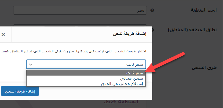 عند النقر على إضافة طريقة شحن سوف يفتح لك تبويب يحتوي على خيارات أسعار الشحن المطلوب تعيينها، حيث يمكنك تعيين سعر ثابت أو استلام محلي للمنتج أو شحن مجاني، قم باختيار (سعر ثابت) على سبيل المثال لتعيين سعر شحن ثابت للمنطقة التي قمنا بتعيينها منذ قليل داخل مصر: