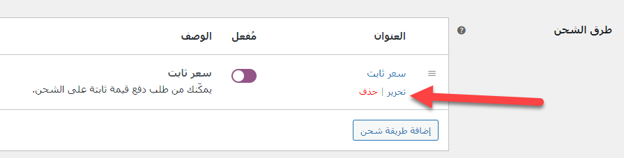 بعد إضافة خيار السعر الثابت للشحن، سيظهر أمامك بالشكل التالي وتجد زر (تحرير) قم بالنقر عليه لكي تقوم بتعيين سعر الشحن الثابت للمنطقة المختارة: