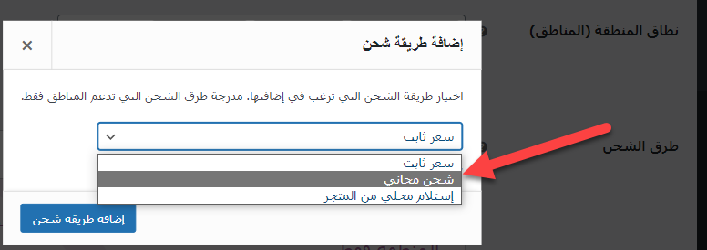 بعدما تعرفنا على طريقة إضافة مناطق ومدن الشحن وتعيين سعر شحن ثابت لكل منطقة، سوف نتحدث هنا عن طريقة تعيين الشحن المجاني أو الإستلام المحلي للمنتجات في أي منطقة قمنا بتعيينها داخل تبويب مناطق الشحن.