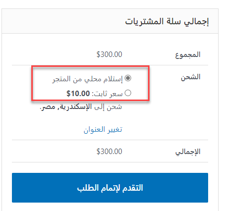 كما يمكنك تعيين سعر شحن ثابت للمنتج في حال طلب العميل شحن المنتج إلى عنوانه، وبالإضافة إلى ذلك يمكنك أيضا إضافة طريقة الاستلام المحلي كطريقة شحن ثانية، وفي هذه الحالة سيظهر داخل سلة المشتريات الخياران أمام العميل، سواء التوجه باستلام المنتج من المتجر، أو اختيار سعر الشحن الثابت لتوصيل المنتج إلى عنوانه: