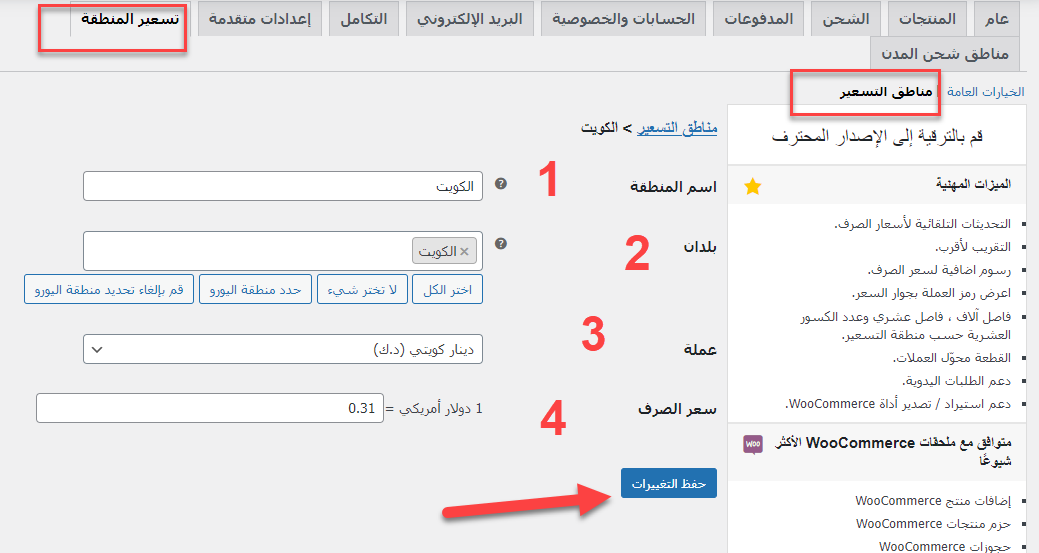 قم بتنصيب الإضافة وتفعيلها على موقعك، ثم انتقل إلى لوحة الإعدادات العامة الخاصة بإضافة Woocommerce، ثم قم بالدخول على التبويب الخاص بالإضافة وهو (تسعير المنطقة) ثم من خلال مناطق التسعير قم بالنقر على إضافة مناطق جديدة:
